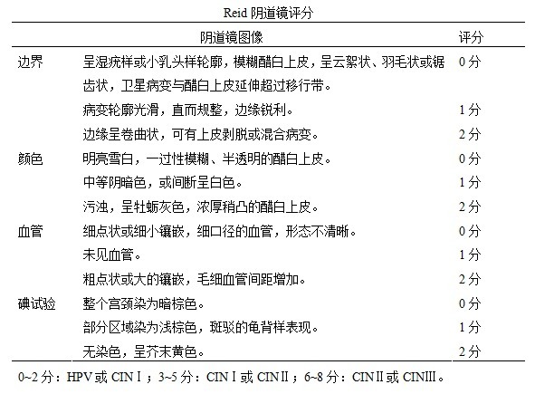 由于阴道镜诊断的主观性较强,因此 Richard Reid 将阴道镜下各种常见图像进行量化评分,评估病变严重程度,以获得较准确的诊断。见下表。